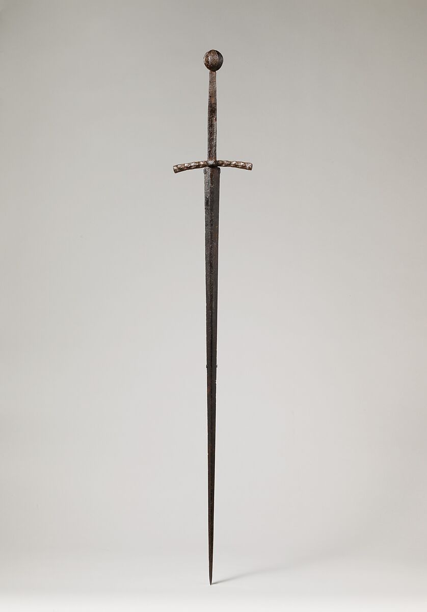 This sword is an extremely well proportioned and elegant example of a type that was in use throughout Western Europe from the late fourteenth through the fifteenth century. The steeply pointed blade, indicating that it was primarily intended for thrusting (rather than cutting), coupled with the stiffness of the blade, made it sturdy enough for its primary function, to pierce armor. The sword's form is further enhanced by the slight horizontal reverse curve and dimpled decoration of the cross guard and the faceted and engraved outer face of the pommel, which bears the word "MARIA," a pious invocation to the Virgin Mary. The spherical shape of the pommel and reverse curve of the cross guard are very unusual and distinctive features for a sword of this period with this type of blade.