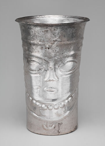 Three-dimensional depictions of courtly rituals on Peru’s North Coast in the first centuries of the second millennium CE include a variety of figures, including dignitaries carried aloft on litters, musicians, and maize beer servers. Sometimes these courtly figures take the shape of a vessel. The figure depicted on this silver beaker has a pronounced, rounded upper back, perhaps representing the convex curvature of individuals with kyphosis. Such physical distinction was not unusual in the royal courts of the ancient Americas, where a distinctive physical appearance may have been seen as special, and closer to supernatural powers.