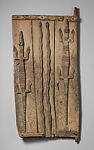 Massive carved doors were sometimes placed at the main entrance of traditional Bamana or Bozo homes. Housing several generations and branches of a family, such domestic structures were built of sun-dried mud bricks and consist of a series of rooms arranged around one or more courtyards and connected by a surrounding wall. Doors at the main entrance sometimes depict animals that are sought by hunters or that figure in creation myths and migration legends. This door depicts two crocodiles, whose rough scaly hide is represented by a series of raised bumps, and two snakes, whose diamond-patterned skin is indicated by incised lines.