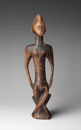 The Senufo peoples form a complex network comprising more than thirty subgroups with many local variations of language and custom. They occupy a large area of West Africa that spans the national boundaries of Côte d'Ivoire, Mali, and Burkina Faso. Senufo society is patriarchal; inheritance, however, is traced through the matrilineal line. Consequently, the primacy placed on women and their essential maternal role is often reflected in Senufo artistic traditions like this sculpture. The Tyekpa association is part of a larger social organization among the Senufo known as Sandogo. Membership in Sandogo is limited to female members of the Senufo community. Senufo life revolves around the Sandogo society and its counterpart, the all-male Poro society. These institutions cut across kinship lines and household ties, creating a social cohesiveness that extends throughout the community.
