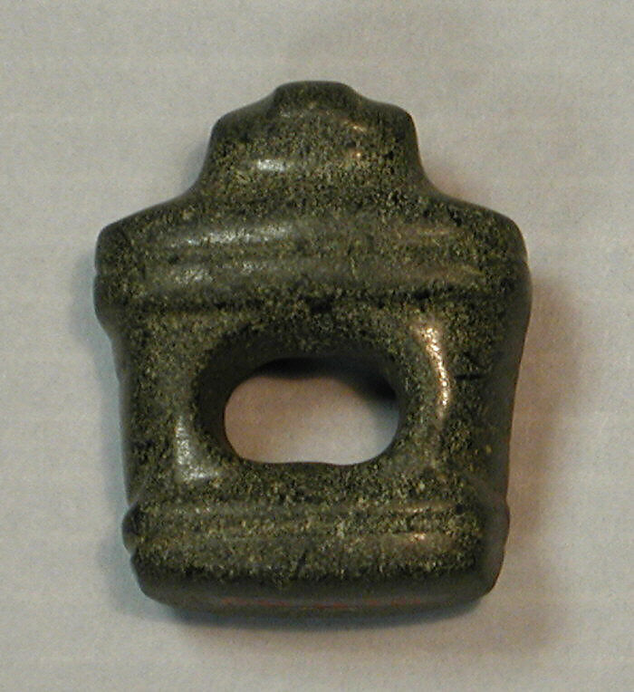 Mezcala models may have served multiple functions over time, in keeping with the Mesoamerican custom of repurposing or re-carving stone objects. Oblong-shaped models (see MMA 1994.35.704), or ones with curved bases (see MMA 1994.35.633), for example, may have been re-carved from celts, ritual tools of great symbolic importance. Several have holes drilled into the base, which could have been used to fasten them with fiber to a larger item such as a ritual bundle, a practice widely known in archaeological and ethnographic contexts in Mesoamerica (see MMA 1994. 35.700). Offerings of Mezcala stone objects in the Templo Mayor, the sacred center of the Aztec capital, Tenochtitlan, built between 1325 and 1519, underscore the importance of these works as a continuation of tradition, as heirlooms, or as emulations of an ancient style.
