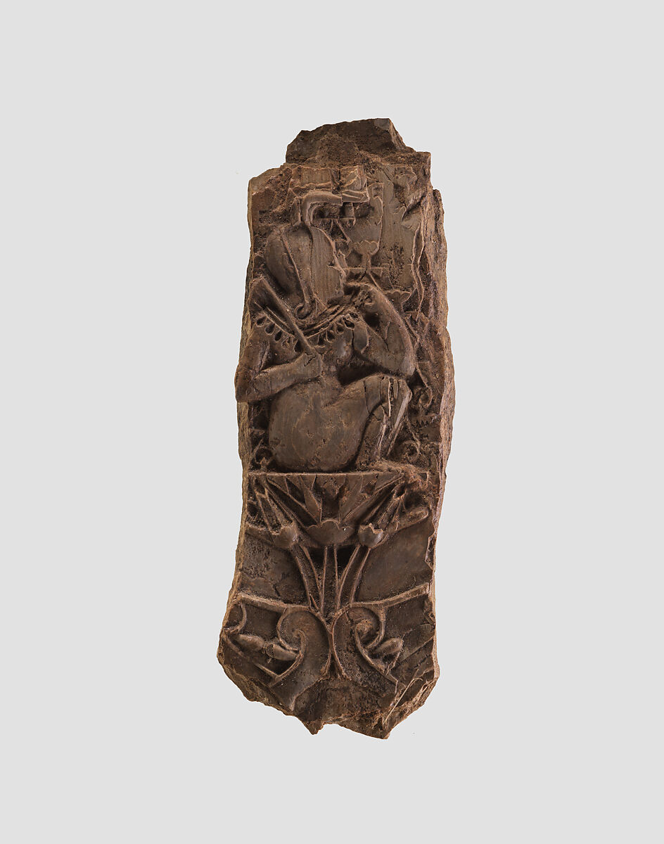 An infant sits in profile on an elaborately carved lotus flower that emerges from a double volute in this fragmentary plaque. Wearing a long robe, he presses one finger to his lips. This Egyptianizing motif, as well as the slender, flowing carving style and embellishments with the cloisonné inlay technique, are all characteristic of Phoenician artistry. Several other elements also drawn from Egyptian art include the wesekh broad collar, sidelock, and crown with a horizontal ram’s horn. The motif of an infant sitting on a lotus flower is known from Egyptian art where it evokes the birth of Horus, the Egyptian sky god, and is also associated with the birth of Ra, the Egyptian sun god. This imagery became significant in the Nile Valley during the Third Intermediate Period, a time that coincided with Phoenician presence in the Levant. While the instrument held by the infant does not survive intact, it was probably the flail, an emblem of Egyptian royalty held over the shoulder that resembles the flywhisk. Another ivory plaque in the Metropolitan Museum’s collection that was found at Arslan Tash in Syria shares this imagery (MMA 57.80.9).
