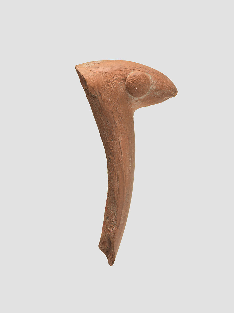 This sherd is the remains of a handle for a ceramic vessel, which takes the form of an abstract animal head with large, pellet eyes. It was excavated at Yarim Tepe in northeastern Iran, six miles south of the modern town of Gonbad-e Kavus. Yarim Tepe was a small settlement, inhabited from the Neolithic to the Parthian period, with many interruptions. This sherd probably dates to the first millennium B.C. There is a long tradition in ancient Iranian pottery of making the spouts or handles of vessels in the form of animals.