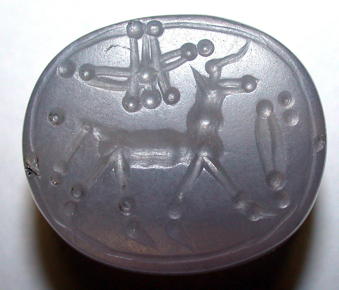 - Title: Stamp seal (scaraboid) with animal and divine symbols