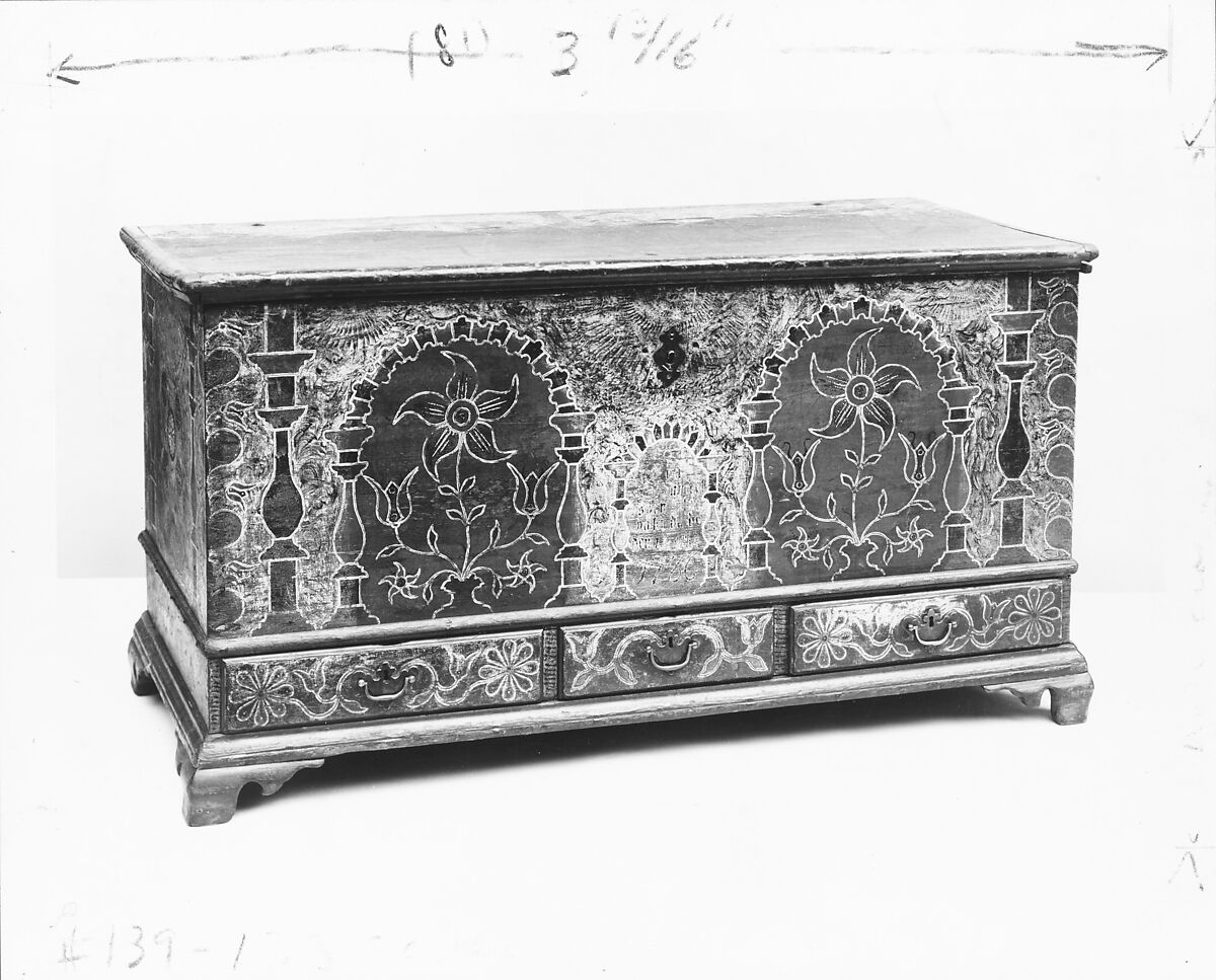 A chest in Franken, Germany, dated 1742, with similar painted panels and applied balusters, indicates the stylistic source of this chest's ornament.