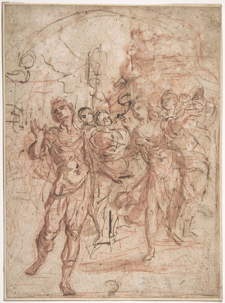 • Medium: Red chalk, reworked with pen and brown ink, brush with brown and red wash on light brown paper