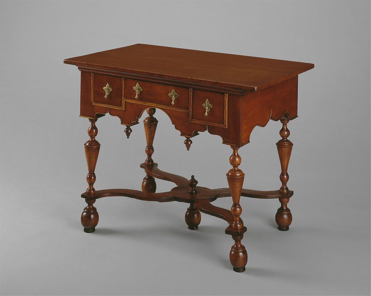 Period inventories refer to this type of table as a “chamber,” “dressing,” or “toilet” table, indicating its use in a bedroom for grooming. The drawers with drop pulls held brushes, combs, pomade pots, and scent bottles. Frequently made as companion pieces to high chests, dressing tables were often topped by a matching mirrored dressing stand or looking glass.
