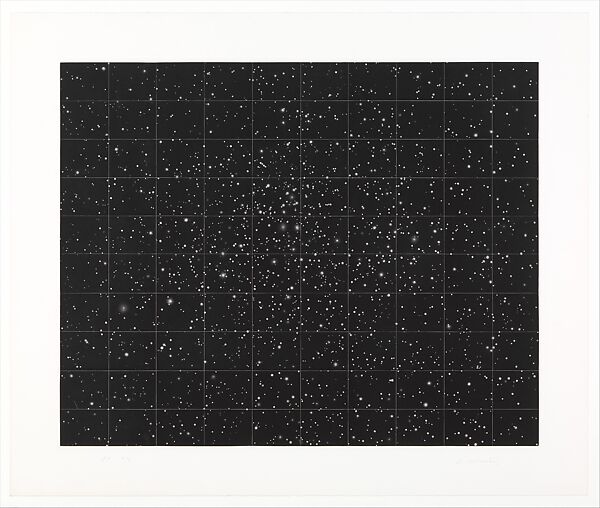 Strata possesses the subtlety, sense of timelessness, and apparent stillness found throughout Celmins’s work. The artist achieved the deep, black velvety tones of the dark night sky by abrading the printing plate. She created a carpet of flickering stars by carving dashes and dots to reveal glimpses of the ivory paper support. Unable to find a mezzotint plate large enough for Strata, Celmins affixed twenty-five smaller copper plates to a single aluminum plate, a process she acknowledged by drawing a grid on the surface of the finished plate. The grid, a form that communicates order, structure, and regularity, while emphasizing the flatness of the pictorial plane, provides a contrast to the illusion of three-dimensionality and expansiveness in the image.