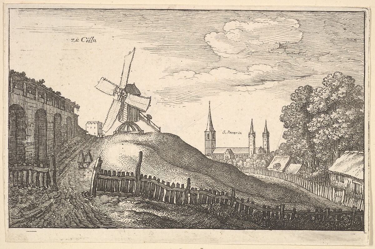 A stone wall with arches crowned with balcony at left, with wooden fence in the foreground; two men walking towards windmill on top of hill in the middle ground; the three spires of the church of St Severin seen beyond, with trees and cottages at right.