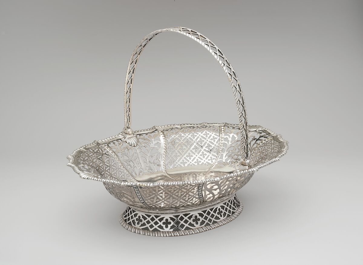 Questo cestino da tavola americano di estrema rarità fu creato per il ricco mercante delle Indie occidentali Samuel Cornell e per la moglie, Susannah, che abitavano a New York e a New Bern, nella Carolina del Nord. Dopo che fu eletto nel consiglio provinciale dello stato, Cornell commissionò diversi oggetti preziosi al famoso argentiere di New York Myer Myers. L’iscrizione sulla parte inferiore del cestino rivela che i Cornells in seguito lo donarono alla figlia Hannah, che sposò Herman LeRoy il 19 ottobre 1786. Con le sezioni traforate a guisa di pizzo, i bordi orlati e il manico traforato fissato su cardini, il cestino imita l’argenteria londinese di migliore qualità.