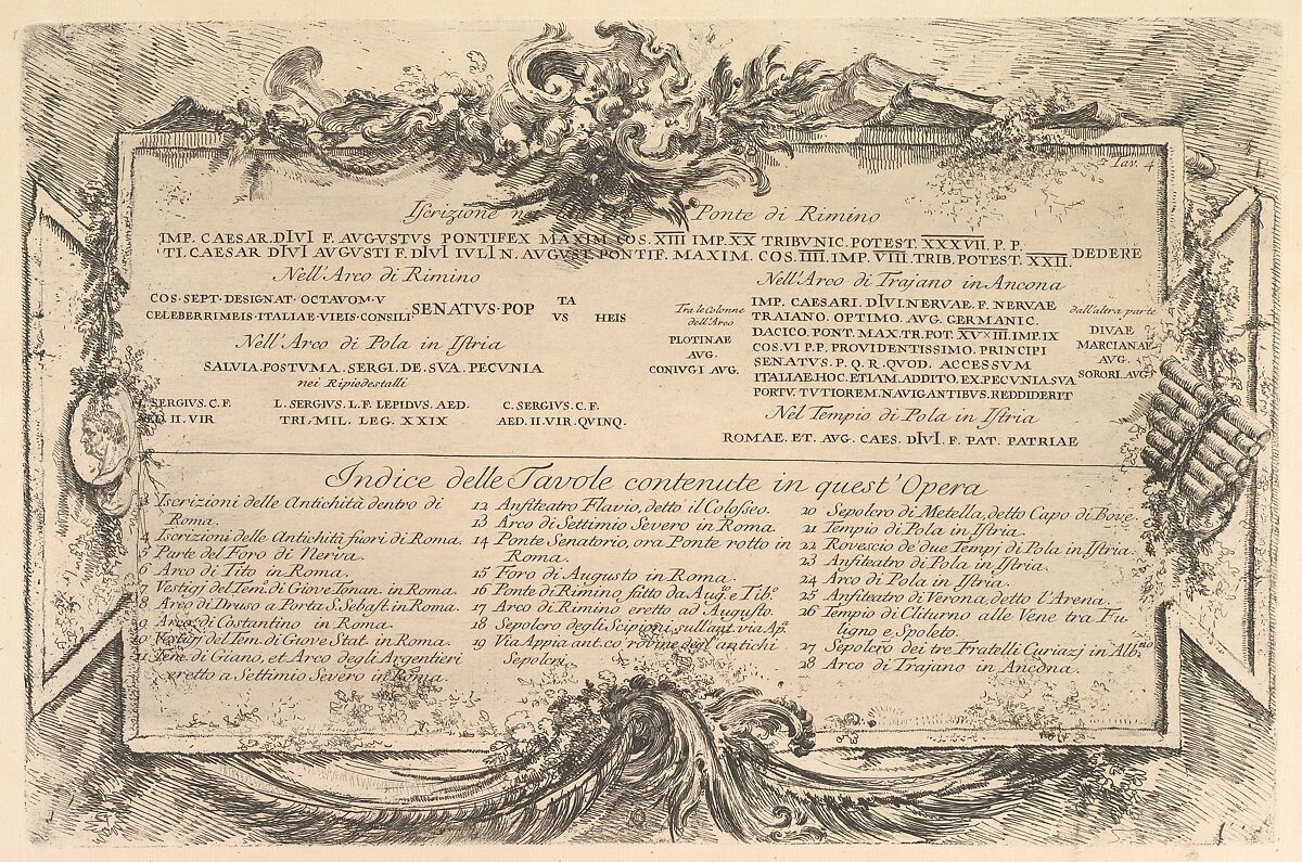 Iscrizione nei lati del Ponte di Rimino (Inscription on the side of the Rimini Bridge) followed by an index of plates in the volume, from "Antichità Romane de' Tempi della Repubblica, e de' primi Imperatori"