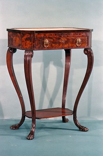 This marble fireplace stand (with its pair 60.67.2), which dates from around 1800, features carved diaper designs on one side of the stand, while the reverse side is unadorned.