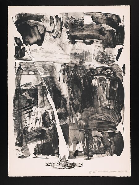 Rauschenberg worked in a variety of media, including print, assemblage, and performance, often juxtaposing seemingly unrelated objects drawn from everyday life. To create this print, he collaged an unexpected assortment of images, including a photographic reproduction of a painting by the eighteenth-century Venetian artist Giovanni Battista Tiepolo, at bottom right, and of a baseball player, seen on the left, culled from an old printing plate discarded by the New York Times. The images are connected by painterly swaths of printer ink, reminiscent of the gestural brushstrokes of Abstract Expressionism. Rauschenberg produced his composition on a lithographic stone, which cracked during the printing process. Rather than abandon the broken stone, he embraced the chance happening by printing the lithograph with the fracture. In addition, he placed the chips of the broken stone at the base of the crack, rendering the defect a central feature of the print.