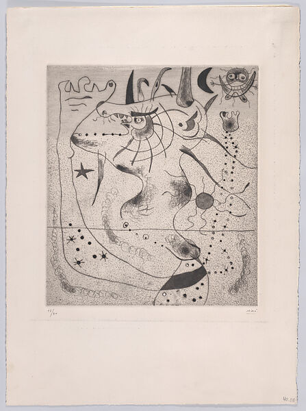 In 1938, Miró began experimenting with the printmaking techniques of etching, engraving, and drypoint. In these intaglio works, he expanded his visual language to reflect not only the possibilities offered by printmaking but also his tortured response both to the turmoil engulfing Spain and to the rise of fascism and likelihood of another world war. Two years earlier, in 1936, he and his family had fled to Paris in order to escape the Spanish Civil War. The atrocities plaguing his native country caused Miró great anguish, and his works from this period offer nightmarish visions filled with frightened animals, grotesque giants, and menacing figures, whose exaggerated teeth, fists, and snarling facial expressions convey terror and suffering. This example came to the Museum through a bequest of William S. Lieberman.