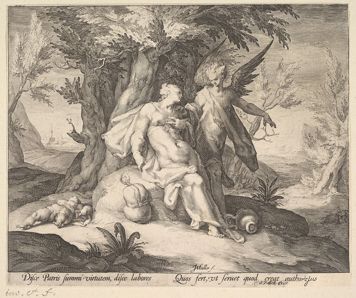 Muller was one of the most sought-after Mannerist printmakers, engraving the compositions of the leading artists of his day. Hagar in the Desert is one of the relatively few prints based on his own design. In it his bravura engraving technique, with its extreme swelling and tapering lines is on full display, particularly evident in the swirling and knotted bark of the tree trunks and the drapery. The figures themselves– Hagar’s remarkably well-muscled body, Ishmael’s foreshortened pose, and the angel’s flowing robes and languid gesture – typify Northern Mannerism at its height.