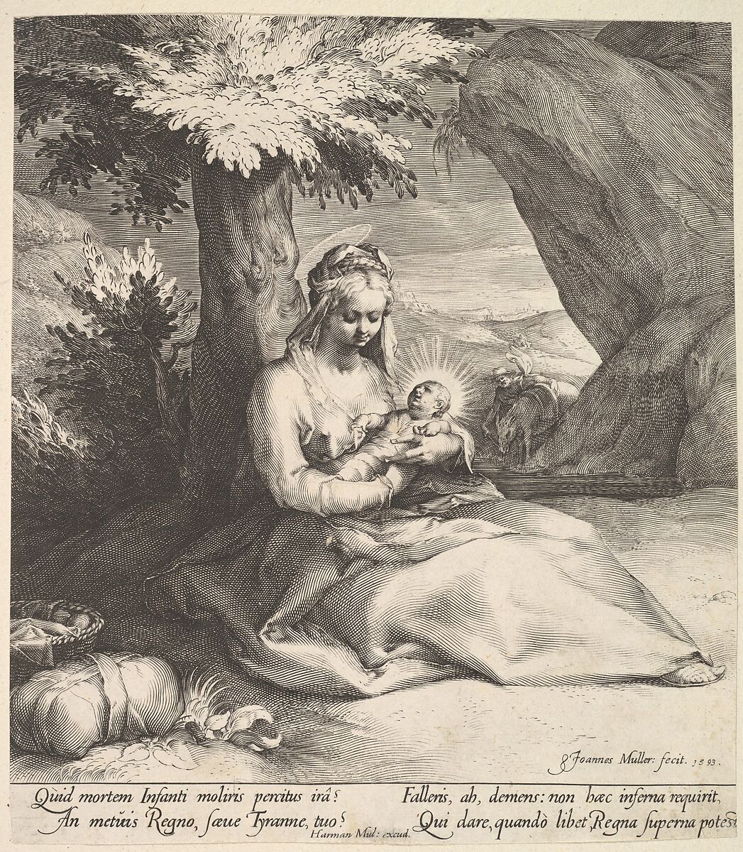 This charming engraving by Jan Muller, one of the very few after his own design, shows the Mary, the mother of Jesus, seated under a tree, looking down at the Christ child she cradles in her arms. The two are bathed in light emanating from his halo, while their surroundings are largely left in shadow. Joseph is relegated to the background, as is usual, here taking care of the family’s mule. This story of the flight from Bethlehem to Egypt to escape King Herod’s persecution is told briefly in the New Testament book of Matthew (2:13-14) and was elaborated on by early Christian and medieval theologians. The inscription below the image is a rebuke of King Herod, and is identical to that on a very rare etching by Muller’s Amsterdam contemporary Gerrit Pietersz. Sweelink (accession nos. 68.681.8 and 1974.547.7)