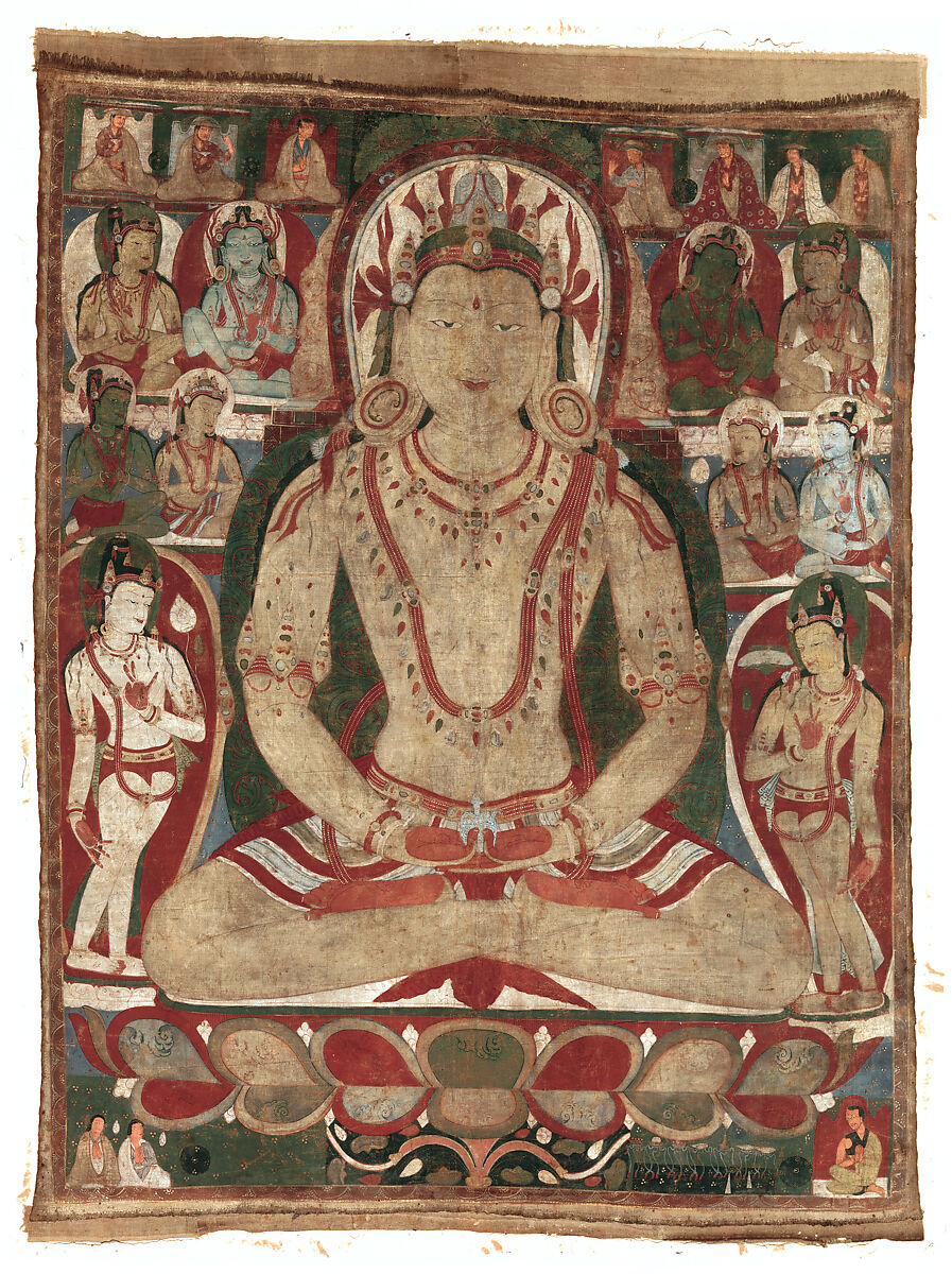 The cult of Amitayus, the Buddha of Eternal Life, was popular in Tibet, where his followers believed that devotion to this Buddha would prolong life. Amitayus is shown holding a jar containing the elixir of immortality, amrita, in his lap. He is richly bejeweled and has a golden complexion, creating radiance appropriate to his transcendent nature. He mediates in a heavenly assembly of bodhisattvas, flanked by two standing bodhisattvas typical of medieval eastern Indian art and an array of seated bodhisattvas who receive his doctrine. The seven figures in the uppermost register are monastic robed hierarchs. In the lower register is a couple, presumably donors of the painting, and a monk, likely their spiritual mentor.