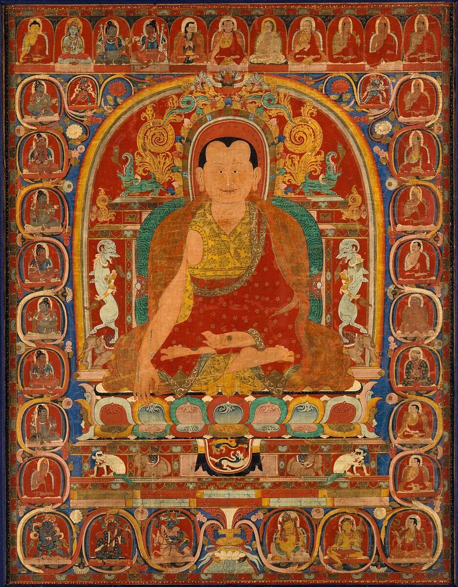 The abbot portrayed here belonged to the Kagyupa order of Tibetan Buddhism, centered in the Ü (dBus) and Tsang (gTsang) regions of Central Tibet. His distinctive facial features and receding hairline suggest a portrait from life, as does the naturalistic physiognomy. He sits on a radiantly colored lotus throne with his right hand in the earth-touching bhumisparsa mudra, emulating the posture of the historical Buddha Sakyamuni at his moment of awakening, rather than the usual preaching gesture (dharmachakra mudra). This sets the portrait apart and points to the lama’s status as a revered spiritual teacher. His lineage of teachers is shown above. Indian pandits occupy the roundels while below are protectors and directional guardians, as well as a monk, shown holding a gilded censer, likely the commissioner of this portrait.