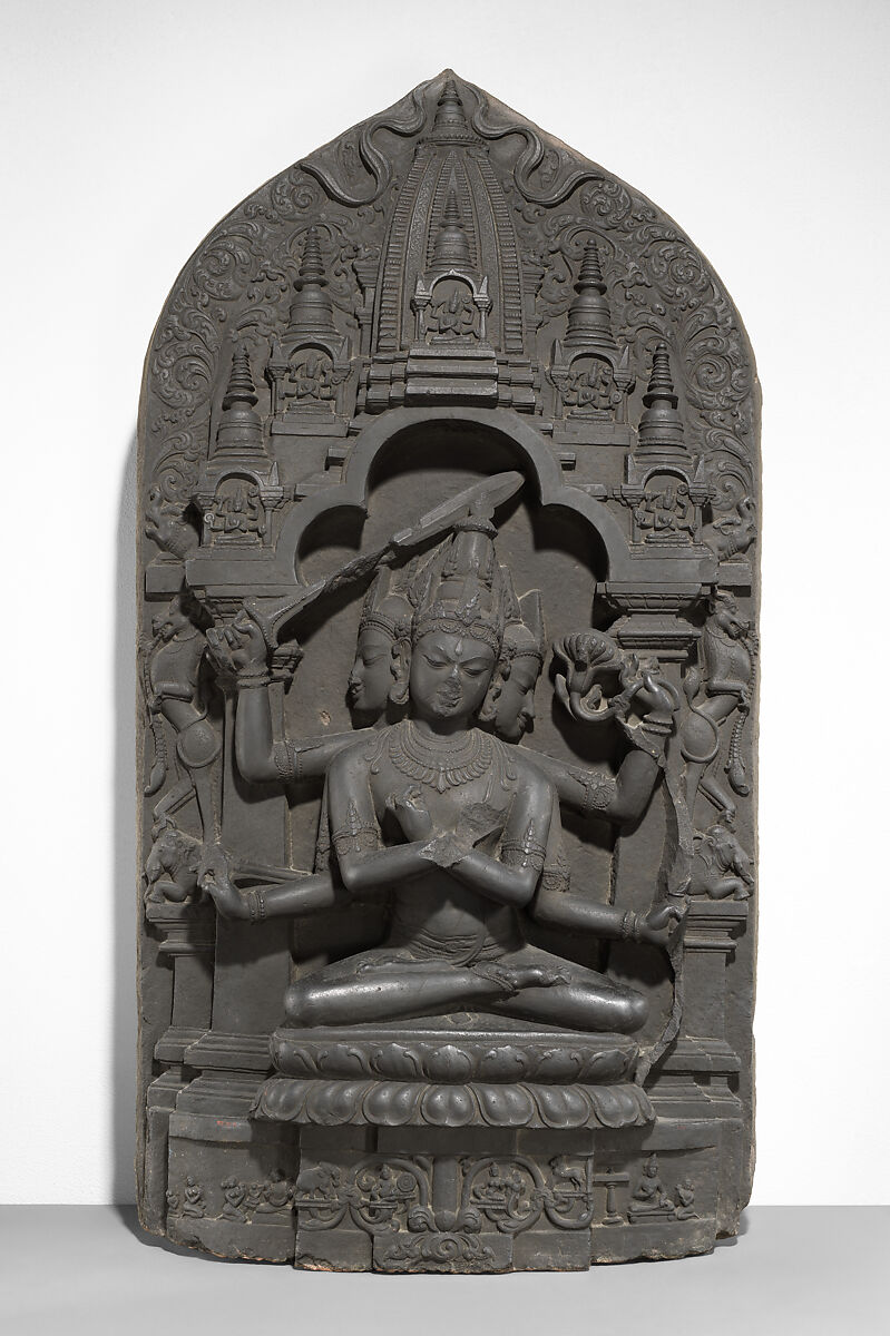 This sculpture represents an esoteric form of Manjushri, the Bodhisattva of Transcendent Wisdom. He has three heads and six arms; four hold a bow and arrow, a sword, and a lotus, while the remaining two hold vajras (thunderbolt scepters) and are crossed at the chest in an esoteric gesture (mudra) identifying supreme wisdom. Most prominent among this array of weapons is the sword, which cuts away ignorance and delusion. Leogryphs standing on lions frame the throne seat; mythical makara issue from the tripartite cusped nimbus; and garlands flutter from the central tower (sikhara).