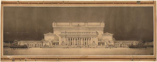 This drawing is part of a group of drawings donated to the Museum by the National Institute for Architectural Education (now the Van Alen Institute). The institute was founded in 1894 as the Society of Beaux-Arts Architects by a group of alumni from the École des Beaux-Arts in Paris to promote and advance architectural practice in the United States of America. Alongside a series of courses, the Society initiated various competitions and awards, of which the so-called Paris Prize, first awarded in 1904, was the most prestigious. The winner of the annual competition was given the opportunity to study at the École in Paris for a year. With the exception of the war years, from 1915 to 1918 and 1941 to 1946, the prize was awarded annually up until 1995. The Met collection holdings contain 78 prize-winning designs for public buildings, monuments and urban planning by 24 architects from the period between 1907 and 1947.