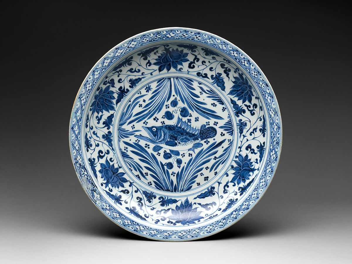 Close examination of the cobalt blue used to paint this dish shows areas of darker blue. Known as “heaped and piled,” this effect is a result of imperfect control of the pigment during firing. This effect disappeared in the early fifteenth century, when potters further mastered the use of this pigment.