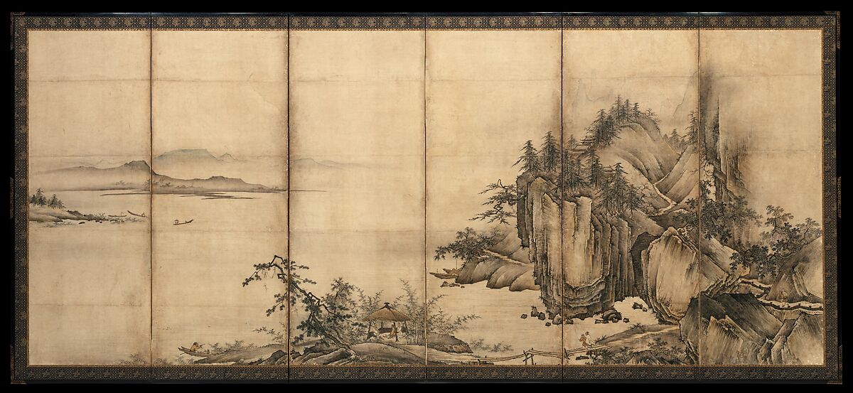 Inspired by Chinese scrolls that invite viewers to travel through time and space along rivers and mountain paths, this monumental landscape in ink transforms an interior into a vast space for imaginary wandering. The quintessential Chinese theme of the scholar-recluse—attuned to the natural world and enjoying its unsullied beauty—reflected Confucian values and aligned with the contemplative bent of Japan’s ruling military class. A timeless quality is achieved here by the seasonal progression from spring and summer (at right) to autumn and winter (at left). The elevated tone, strong delineation of forms, and rhythmic brushwork corroborate the work’s attribution to the Kano school painter Chōkichi.