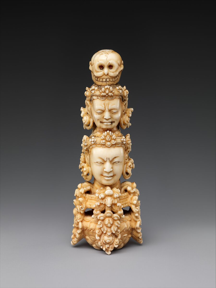 Tibetan Buddhism was practiced at the Chinese court throughout the fifteenth century. This finial would have capped a long staff used in Buddhist rituals to quell demons, which are symbolic of obstacles that must be overcome to reach enlightenment. Depicted on this implement are an overflowing vase (an Indic symbol of abundance) and three heads (one human, one decaying, and one skeletal), which represent the inevitability of change and death.