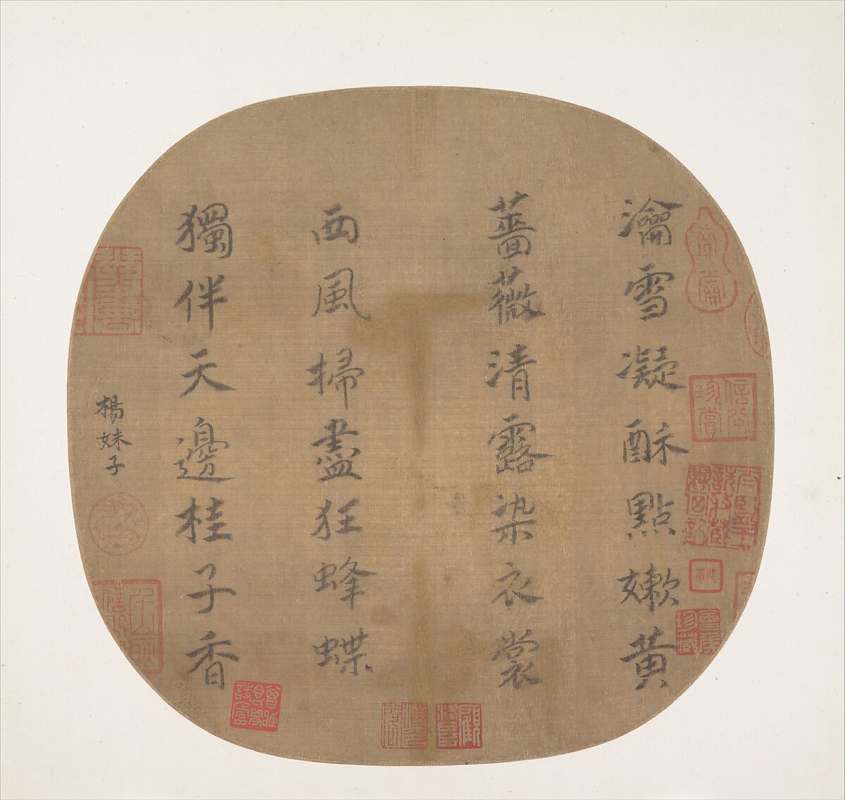An excellent calligrapher who practiced the imperial style initiated by Gaozong (r. 1127–62), the empress may have inscribed this poem on the opposite side of a fan painting of roses by a court artist:
