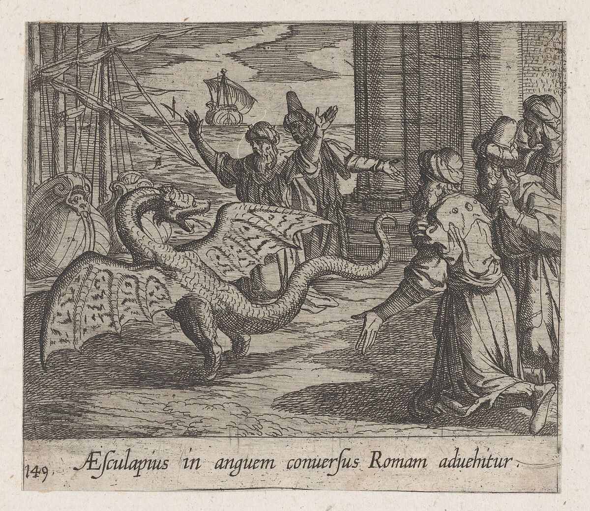 Plate 149: Aesculapius as a Serpent, Among the Romans (AEsculapius in anguem conversus Roman advehitur), from Ovid's "Metamorphoses"