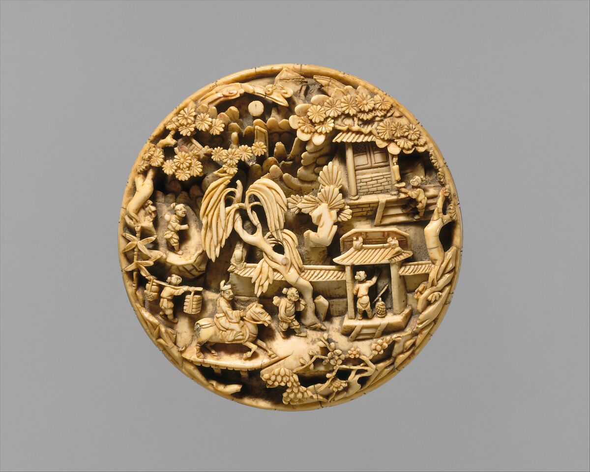 The motif of a scholar gentleman riding in a moonlight landscape is also found in Chinese paintings. In this richly carved scene, the scholar rides on horseback while four young attendants carry his supplies and a fifth hastens to open the gate to the family compound. The scholar gentleman is understood to be returning from a spring outing filled with wine and poetry.