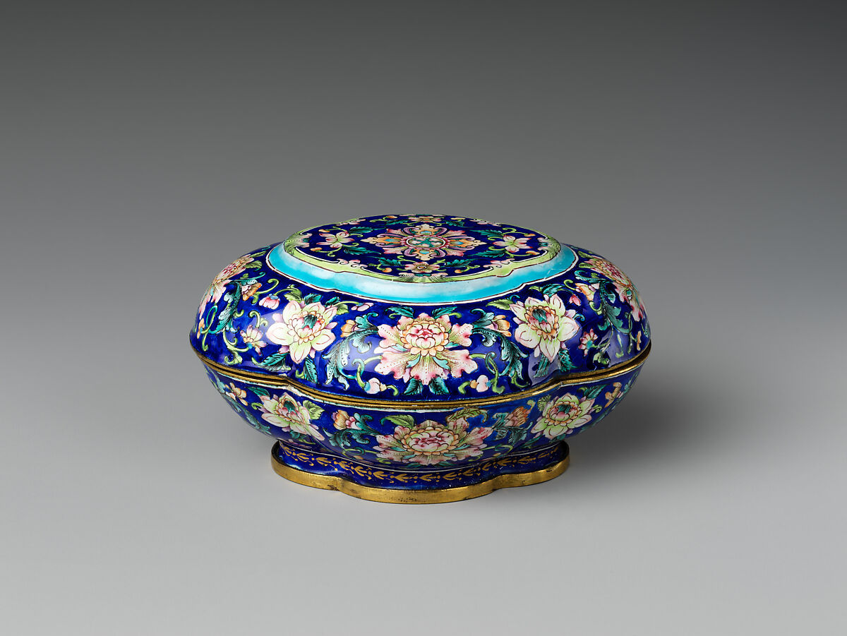 Introduced from Europe, the technique of painted enamel was also commonly used by Chinese makers to decorate local wares, such as this incense set. Three-piece sets like this one appeared in China no later than the thirteenth century and included censers to burn small pieces of incense over burning charcoal. The box would have contained incense woods or balls, and the bottle would have held a pair of chopsticks and a spatula for handling the incense materials. (Set includes (81.1.638a–c, .642, .637a, b)