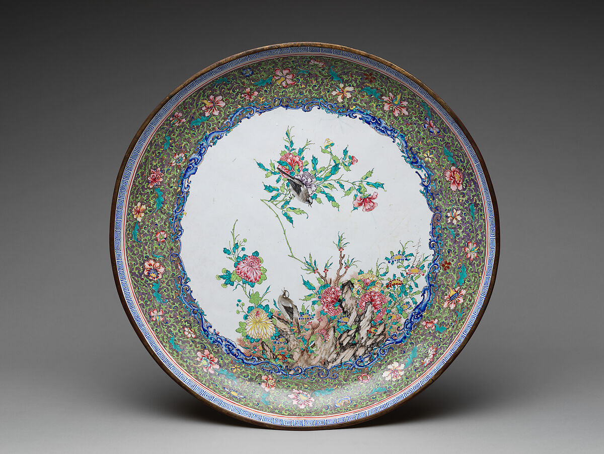 As the first point of contact between Europe and China, Canton (now Guangzhou) was a center of enamel production and distribution throughout the eighteenth and the nineteenth centuries. Wares from the city’s workshops, known as “Canton enamels,” commonly featured popular motifs based on court designs from Beijing. One of the most favored examples depicts lively birds and flowers surrounded by a dense floral border. This design can be found on enameled porcelain created for both domestic and export markets.