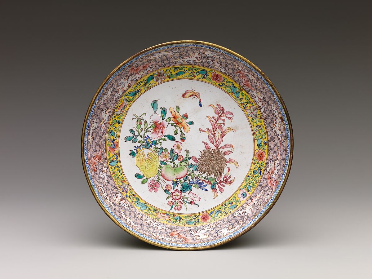 Encircled by a tightly arranged geometric and floral border, the center of this dish features auspicious fruits and flowers accompanied by a butterfly. Such openwork design is commonly found on both painted enamel on copper alloy and enameled porcelain in the mid-eighteenth century.