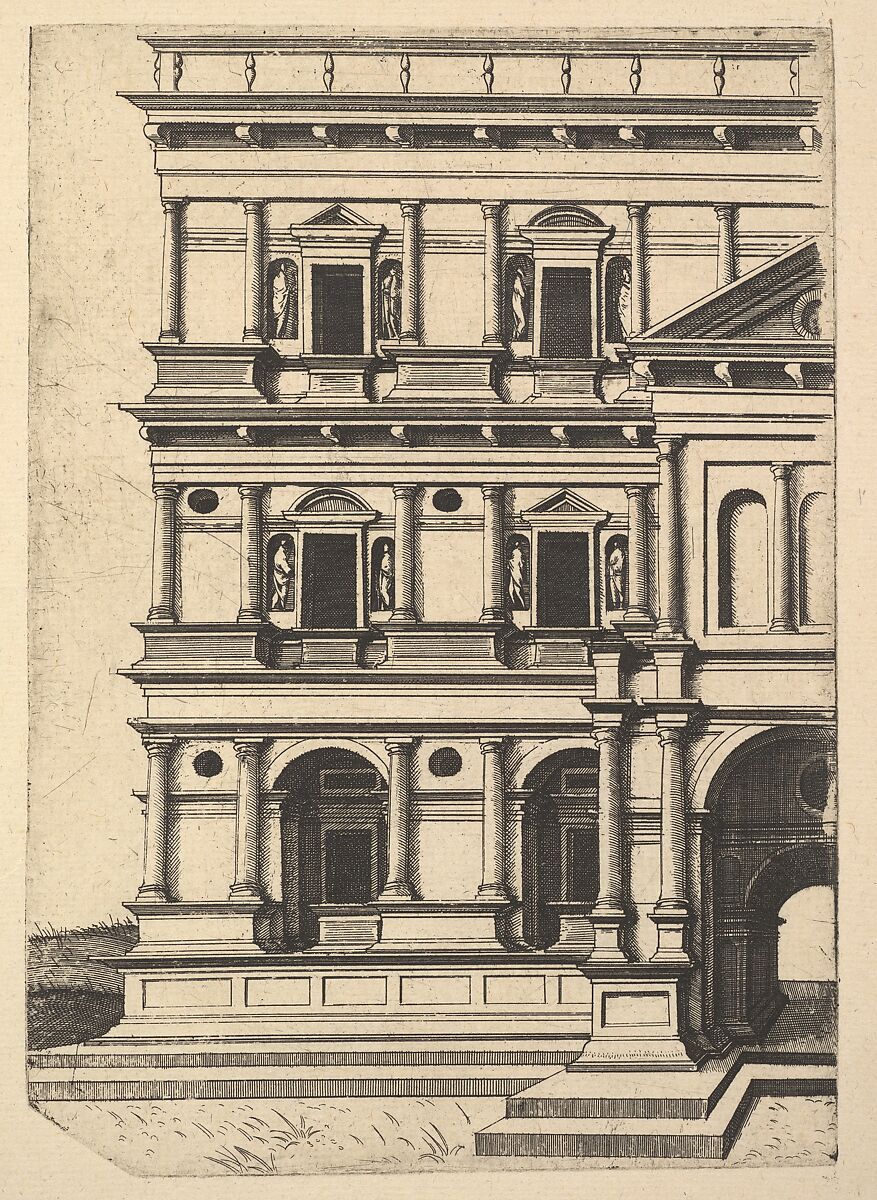 Perspectival view of the leftt side of a building described as the palace of Emperor Claudius. The building consists of three stories crowned by a balustrade and three bays of what is likely a five-bay façade have been depicted. The bay on the right (the central bay of the façade) shows the entrance way, marked by an avant-corpse with its own attica and a pediment. It is not clear whether this rendition is based on a specific building in Rome, or whether the printmaker is relying on his imagination based on a description of the palace in an historic source.