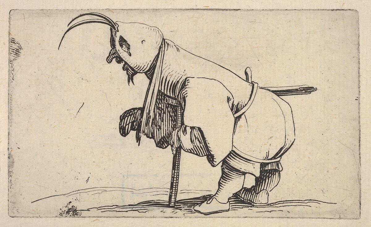 - Title: Hooded small figure hunched over a crutch, in profile view with left leg positioned forward and sword affixed to right hip, from "Varie Figure Gobbi"