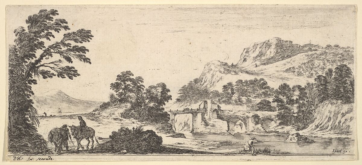 - Title: A mule carrying a woman and a peasant walking with a mule to left, a fisherman to right casting his line towards the right, a bridge in the center background, from "Various Landscapes" (Divers Paysages)