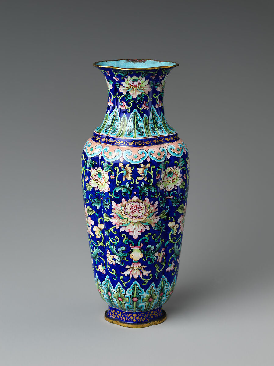 Introduced from Europe, the technique of painted enamel was also commonly used by Chinese makers to decorate local wares, such as this incense set. Three-piece sets like this one appeared in China no later than the thirteenth century and included censers to burn small pieces of incense over burning charcoal. The box would have contained incense woods or balls, and the bottle would have held a pair of chopsticks and a spatula for handling the incense materials. (Set includes (81.1.638a–c, .642, .637a, b)