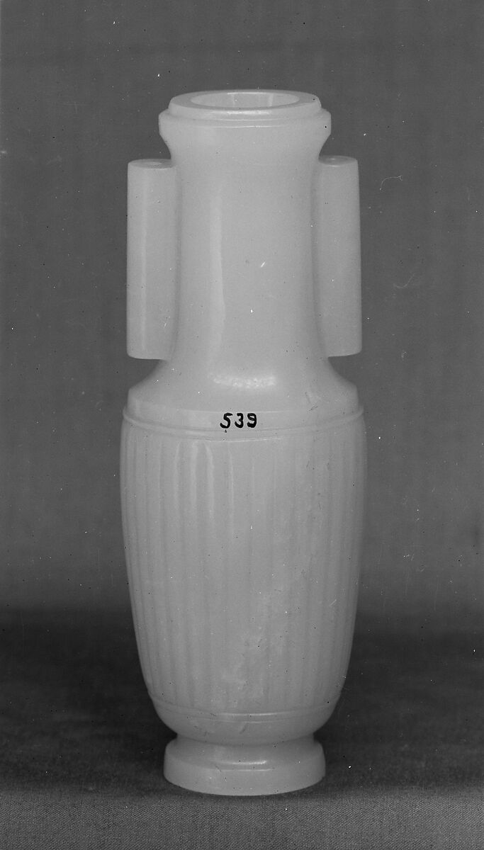 This incense set, consisting of an incense burner, a covered box, and a slender vase, is made from flawless white nephrite, the most desirable kind of jade. The relatively small scale of the vessels suggests that they are meant to be desktop ornaments rather than to serve a practical function. They are typical of an innovative style of the eighteenth century, when Chinese craftsmen created novel designs by combining traditional forms with decorative elements from foreign cultures. While the shapes of the vessels are derived from local ritual receptacles, their thin walls and delicately fluted sides are unmistakably inspired by the jades of Mughal India. (Set contains: 02.18.537a, b; .538a, b; .539)