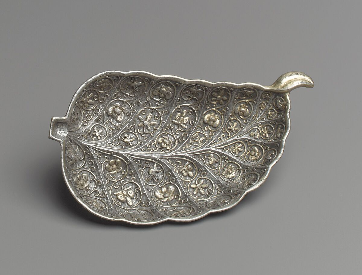L’arte della lavorazione dell’argento raggiunse il culmine in Cina durante la dinastia Tang (618 - 906), quando gli stretti rapporti con le regioni dell’Asia centrale ed occidentale introdussero influenze straniere sia nelle forme che nei motivi. Anche le tecniche di fabbricazione cambiarono, passando dai metodi di fusione tradizionali alla lavorazione al maglio e alla cesellatura. Questo raffinatissimo piatto a forma di foglia, decorato con motivi floreali e uccelli utilizzando la tecnica del repoussé (a sbalzo), è un tipico esempio dell’eccellenza dell’arte decorativa Tang.