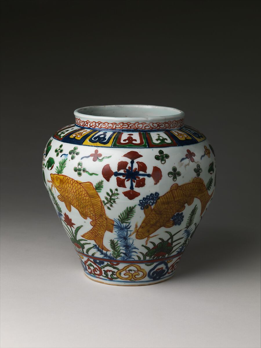Perfecting the enameling techniques developed earlier in the Ming dynasty, porcelain enamelers of the Jiajing period created rich reds, yellows, and greens, superimposed onto underglaze blue. Contemporaneous sources attest to the firing of two hundred jars with similar pond scenes during the twenty-first year of the Jiajing reign (1542). Eroded areas of similar jars in other museums show that the deep red hues were created by overlaying a red enamel on a yellow base, a technique that lends the design an immediate visual impact.