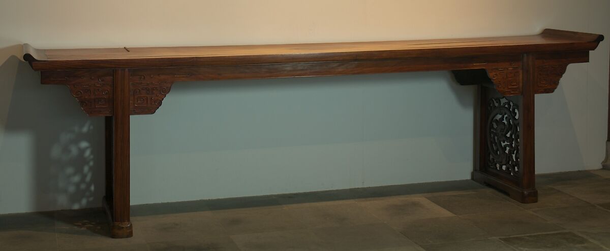 This table was probably used as an altar along with a complement of ritual vessels for performing the prescribed ancestral memorials. The slightly splayed end panels, reticulated with roundels of dragons, are set into shoe feet.