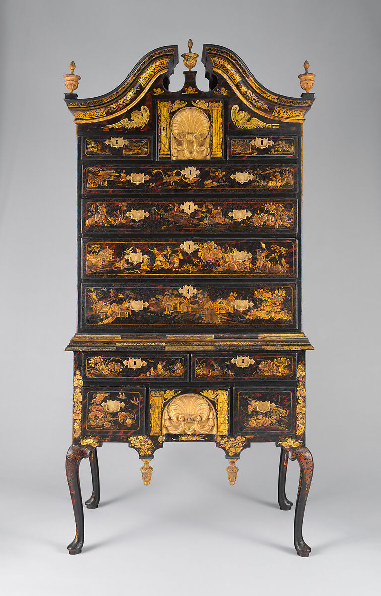Il cassettone con piedi a ricciolo e la parte superiore a voluta o cassettiera alta, in cui il cassettone in stile inglese, piatto in cima e dotato di piedi d’appoggio, è ornato da un timpano interrotto, era la forma di mobile coloniale più ambiziosa e più tipicamente americana. A Boston, dove il modello fu introdotto intorno al 1730, i più pregiati tra i primi esemplari erano quelli laccati, dipinti a imitazione delle lacche giapponesi. Questo esempio, unico in quanto pervenuto con il tavolo da toeletta abbinato e la specchiera, è dipinto con un fondo che richiama il guscio di tartaruga, su cui sono accennati motivi in oro di ispirazione cinese: figure fantastiche e gazebo. Fu costruito per Benjamin Pickman, un mercante di Salem nel Massachusetts, e rappresenta l’esempio migliore dell’eleganza cosmopolita propria delle colonie del New England.