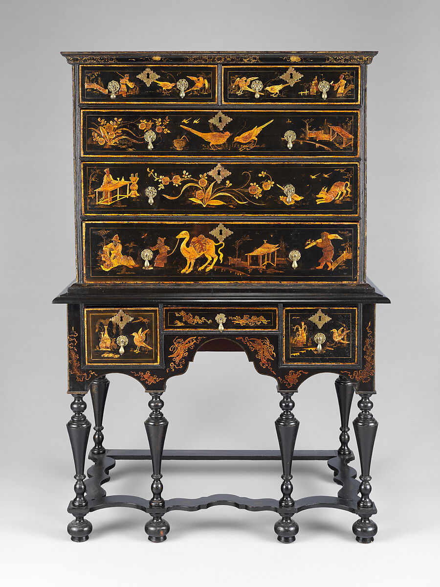 Japanning, a Western imitation of lacquerwork, became fashionable in the colonies after 1700. A stylish surface treatment in which motifs of vaguely Far Eastern origin were raised, gilded, and varnished, japanning was applied to standard furniture forms and, when bright and new, must have produced a dazzling effect. Here the motifs are arranged on a solid black ground in a relaxed, undulating pattern in which people, animals, oversize flowers, and tiny pavilions happily coexist. A new form introduced in the colonies in the 1690s at the same time as the early Baroque style—known in America as the William and Mary style—the high chest of drawers was the most prestigious piece of furniture in the early eighteenth century. Built in separate upper and lower sections, it was characterized in this period by a skirt and stretchers enlivened by curves and turned legs and feet on which bulbous shapes were boldly juxtaposed to narrow tapers. One of the earliest American examples of japanning, this high chest descended in the Pickman family of Boston and Salem.