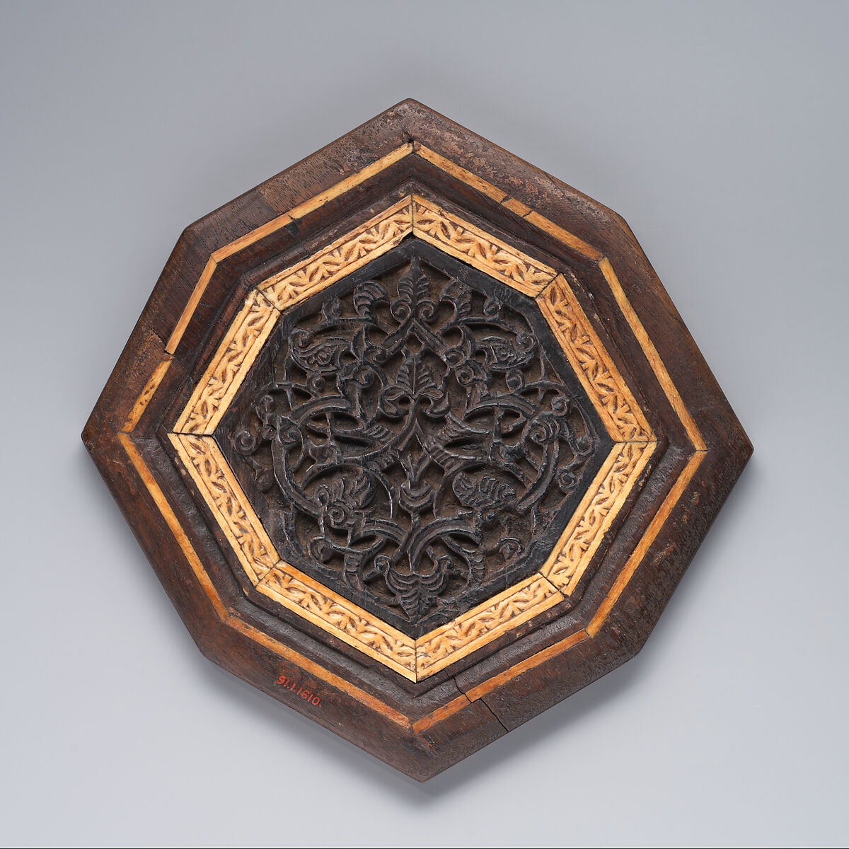 Part of a pair with object 91.1.1609 this octagonal wooden panel is typical of Mamluk woodwork. The carved pieces of inlay with the characteristic arabesque of split-leaf palmettes, and the sharp contrasts between the dark wood and the ivory are found in many such panels. A third object from the collection (07.236.58), a fragment of a six-pointed star, follows the same design as the octagonal panel. Possibly all three panels were part of a larger object, such as a minbar or a wooden door.