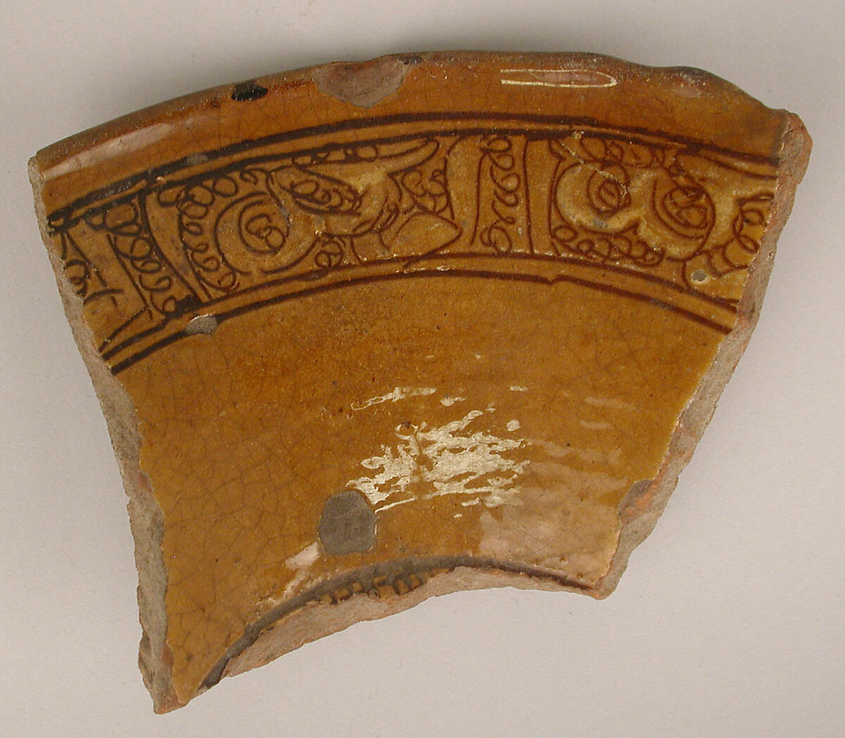 - Medium: Earthenware; incised decoration through white slip and coloring under transparent glaze
