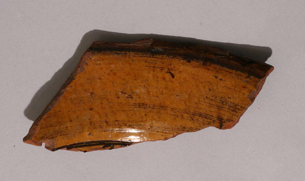 - Medium: Earthenware; incised decoration through white slip and coloring under transparent glaze