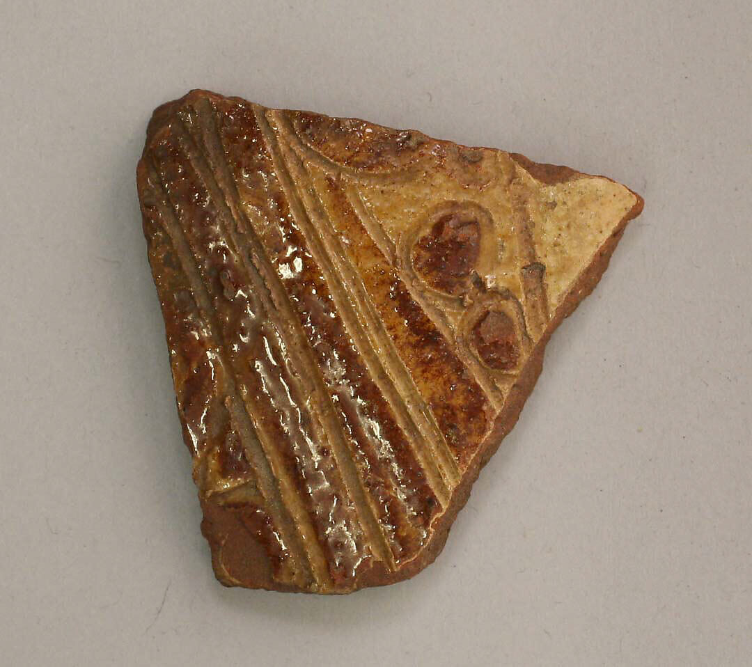 - Medium: Earthenware; incised decoration through white slip and coloring under transparent glaze
