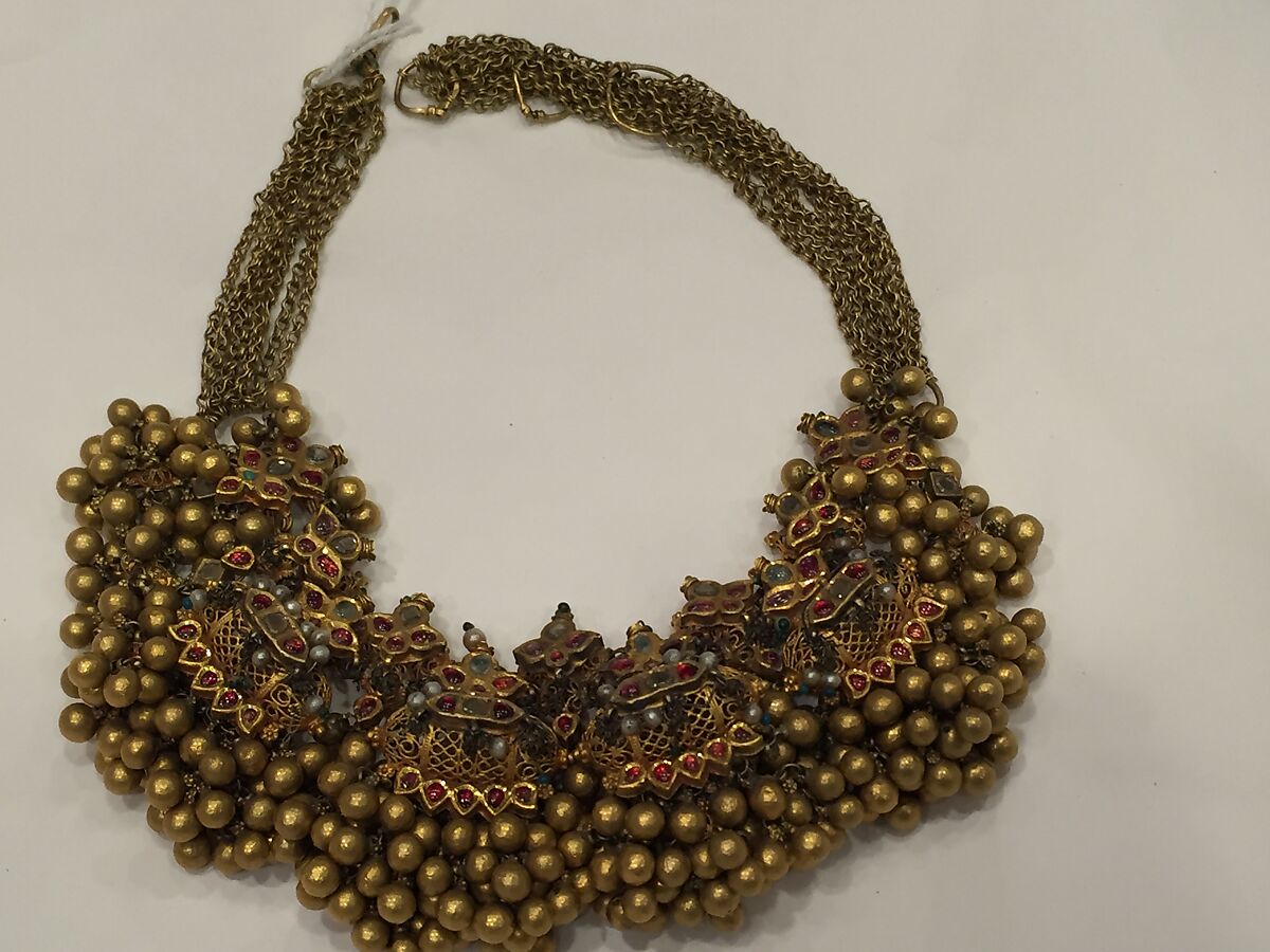 This necklace is comprised of four tawiz, or amulet shaped pendants, fabricated from gold filigree, and embellished with gemstones and pearls. Clusters of gold beads are suspended from each pendant, giving articulation to this jewel with the movement of the wearer. This form has been referred to as a kaliganthi, a necklace given to a bride on her wedding day by her in-laws.