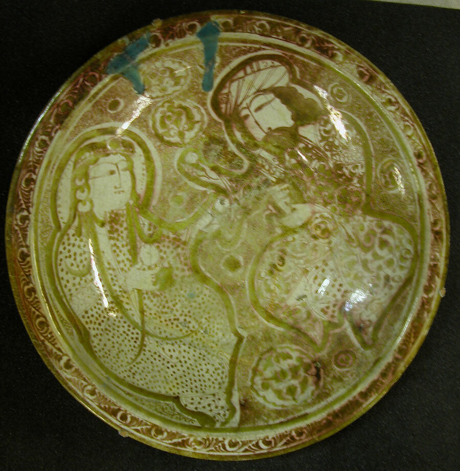 A bearded male figure in a turban faces a woman wearing long earrings and playing the cymbals. Both figures are set against a background of arabesques and medallions. Although the heavy line that outlines the figures is characteristic of lusterware made in Rayy, Iran, the dense background on this exceptionally large bowl is unusual.