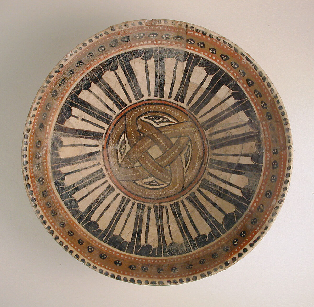 A peculiarity of this and related types is the use of an olive-colored slip, sometimes greener than here. Such pseudo-inscriptions are frequently found, conjucted with a central decorative roundel.